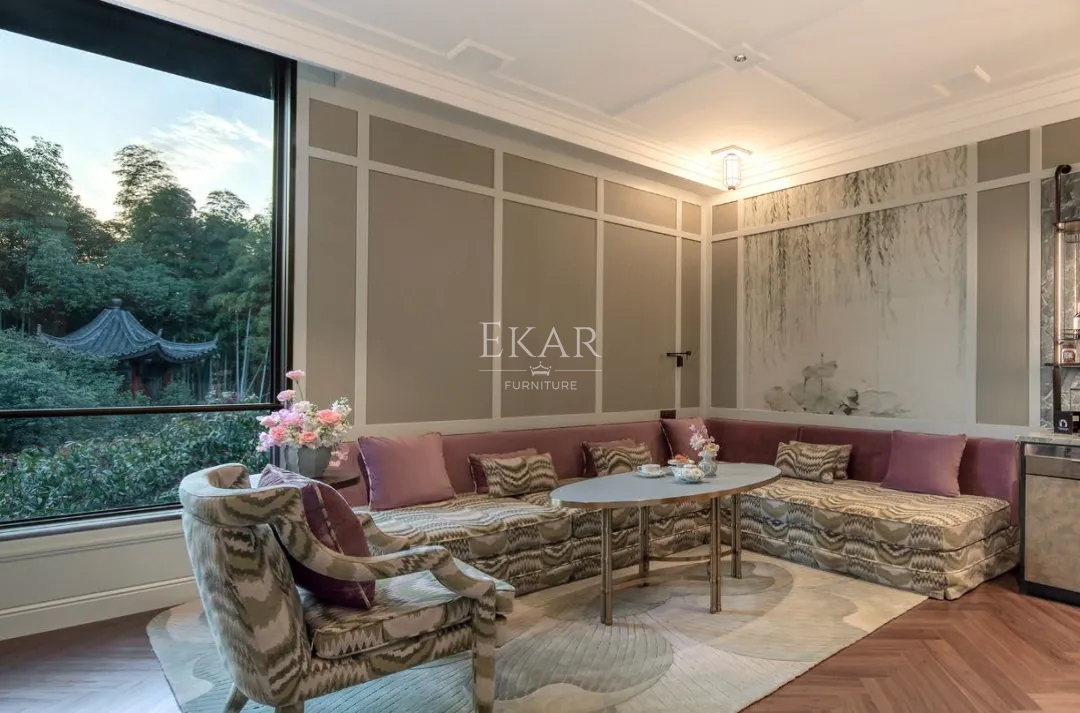 For the in-room lounge areas, we moved away from standard seating. We created custom L-shaped corner sofas wrapped in patterned fabrics that complement the wall treatments. The color palette—soft sage greens, mauves, and creams—required precise fabric sourcing, which is a core strength of the EKAR FURNITURE team.