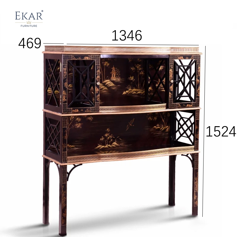 The EKAR Dynasty Chinoiserie Luxury Console is a monumental piece of artistic furniture, meticulously designed to serve as the definitive focal point for a prestigious grand foyer or hallway. This piece captures the lyrical essence of 18th-century English "Cabinet on Stand" design, where the architectural authority of British cabinetry meets the mystical allure of Eastern-inspired Chinoiserie. The silhouette is defined by its slender, high-profile legs and a sophisticated tiered body that provides a sense of monumental dignity without overwhelming the room’s visual flow. As a flagship product from our Foshan furniture factory, it reflects a commitment to the highest levels of customized furniture design, offering a look that is both historically regal and perfectly scaled for the expansive proportions of luxury villas and high-end residential estates.