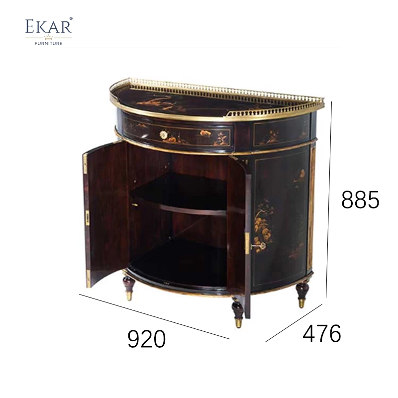 The EKAR Dynasty Heritage Console Cabinet is a monumental expression of artistic authority and historical grace, designed to serve as the definitive focal point for the world's most prestigious entryways. Produced by EKAR FURNITURE, a world-renowned mid-to-high-end furniture customization factory, this piece captures the lyrical essence of 18th-century British cabinetry merged with the mystical allure of Eastern-inspired Chinoiserie. The silhouette is defined by its sophisticated demilune or half-moon profile, which allows it to fit gracefully against grand foyer walls without interrupting the architectural flow of the space. As a flagship product from our Foshan furniture factory, this cabinet reflects a commitment to the highest levels of global luxury, offering a look that is both historically regal and perfectly scaled for contemporary high-end residential estates.