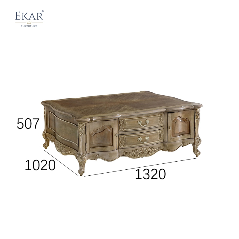 While the EKAR Isabelle is a triumph of decorative design, it is also engineered for exceptional utility. The front facade houses a combination of storage solutions that are rare in traditional coffee tables. Two spacious central drawers offer the perfect place to stow away remote controls, magazines, or coasters, keeping the tabletop clutter-free. Flanking these drawers are two side cabinets with panel doors, providing discreet storage for larger items like albums, blankets, or board games. The drawer and door fronts are seamlessly integrated into the serpentine curve of the table, maintaining the fluid lines of the design. They are adorned with decorative, antique-style metal hardware that complements the carving. This thoughtful inclusion of storage ensures that your living space remains organized and serene, proving that high style and practicality can coexist beautifully.