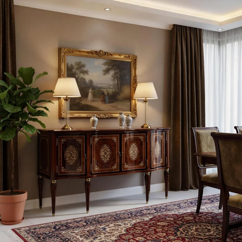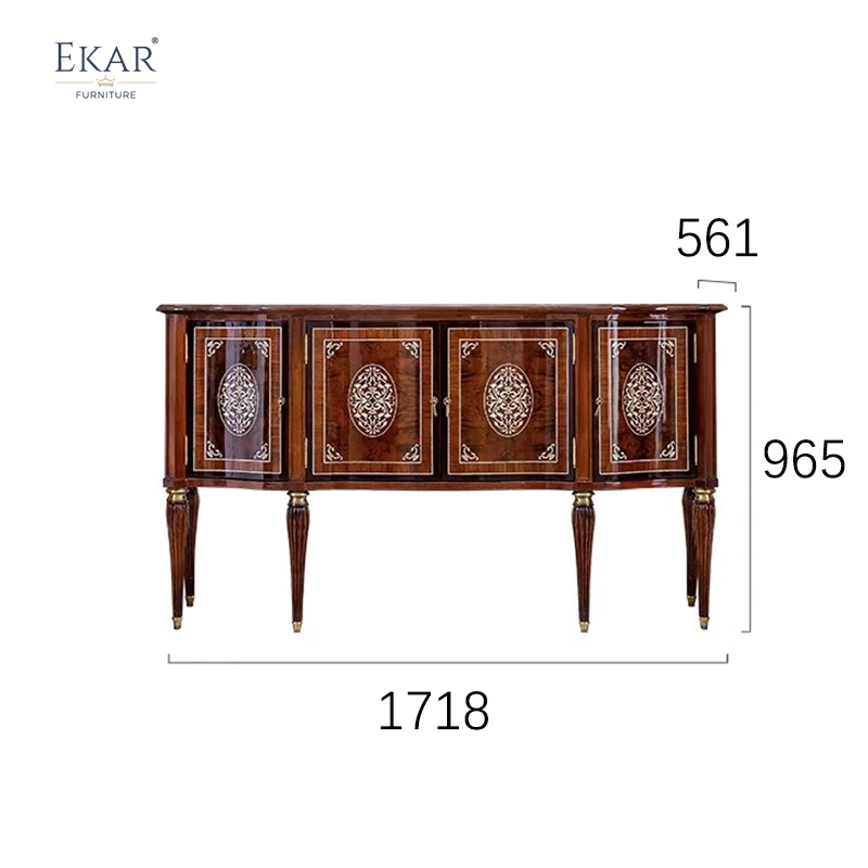 In terms of application, the EKAR Regency Heritage Sideboard is specifically curated for grand foyers, formal reception halls, and upscale residential dining rooms. Its unique profile and opulent wood tones allow it to harmonize with a variety of décor themes, from strictly traditional British manors to more contemporary, high-concept penthouses that require a touch of historical gravity. It pairs naturally with high-backed upholstered chairs, marble-topped tables, and ornate crystal lighting to create a fully immersive luxury environment that reflects a refined taste for global excellence. Choosing a piece from our Foshan export furniture factory is an investment in a global legacy of success. This sideboard promises to deliver a visual legacy of elegance and a functional masterpiece that remains a global standard for luxury customized furniture across the world.