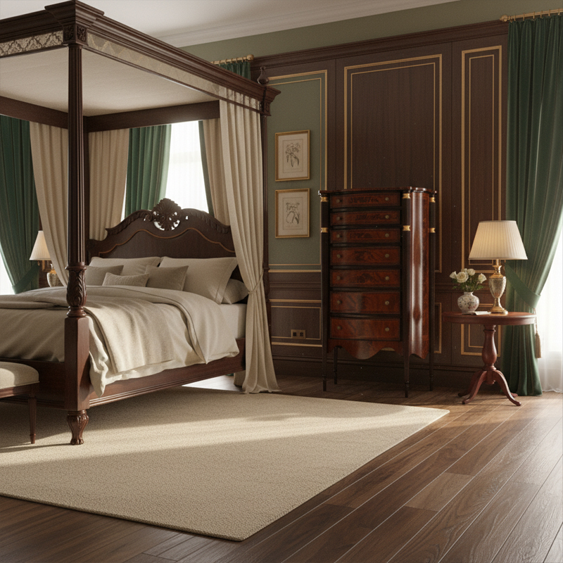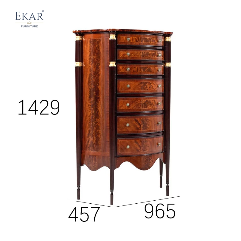 In terms of application, the EKAR Regency Heritage is specifically curated for grand master chambers, high-concept boutique hotel suites, and upscale residential dressing rooms. Its seven-drawer "Semainier" configuration—originally designed for each day of the week—provides immense storage capacity for personal linens, delicate apparel, and jewelry, while its slender footprint makes it an ideal choice for maximizing space in luxury interiors. As a central component of high-end customized furniture, it pairs naturally with high-profile upholstered beds and traditional wall moldings to create a fully immersive luxury environment. For interior designers sourcing from a Foshan export furniture factory, this tallboy provides a versatile foundation that works harmoniously in traditional British or more eclectic, "Old World" interior themes.