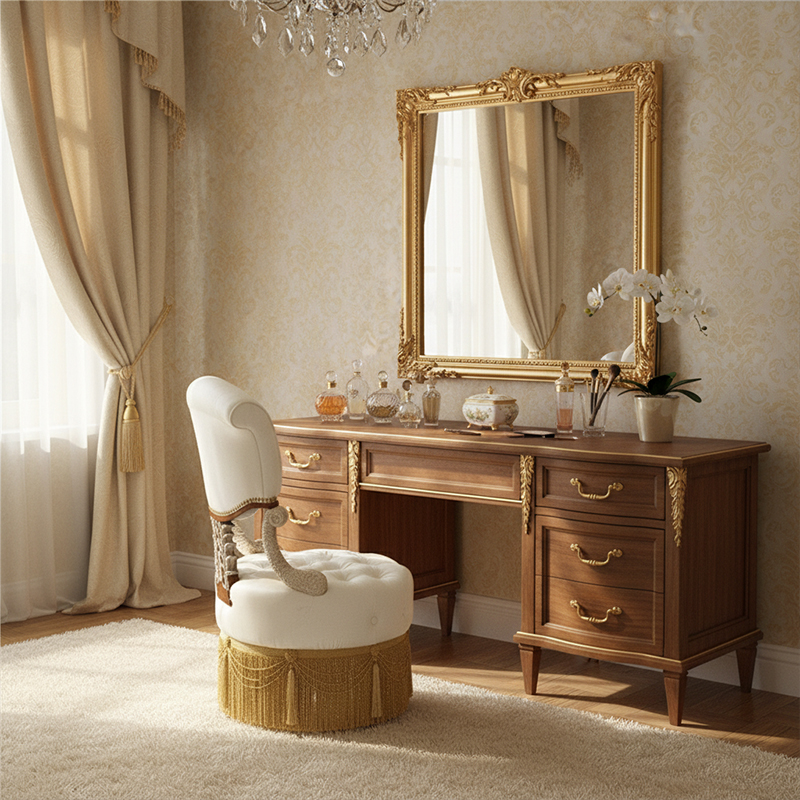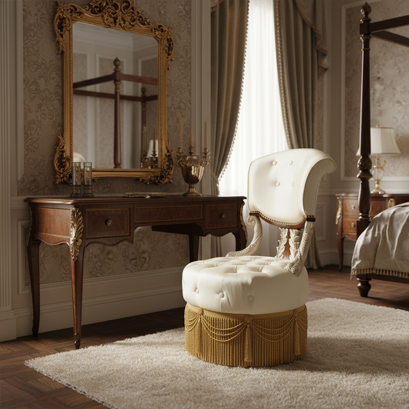 In terms of application, this versatile vanity throne is specifically curated for the most prestigious interior zones, including grand master chambers, high-concept walk-in closets, and upscale bridal suites. It functions as a majestic centerpiece when paired with large-scale marble vanities or ornate silver-leafed dressing tables, creating a fully immersive environment of royal preparation. Its unique color palette of shimmering ivory, silver carvings, and golden fringe allow it to harmonize with a variety of décor themes, from traditional British manors to more contemporary, "New Classic" metropolitan interiors. For interior designers sourcing from a Foshan export furniture factory, this chair provides a flexible foundation that brings a touch of historical grandeur and artistic flair to any private sanctuary or high-end hospitality suite.