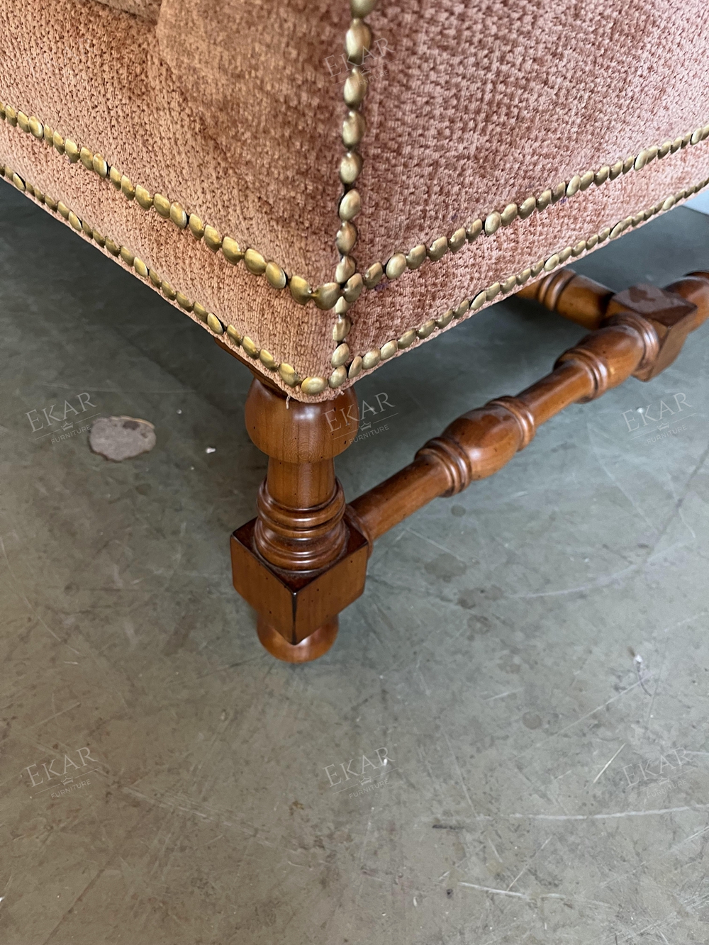 EKAR Riviera Retro Lounge Chair – Rustic wood frame, plush upholstery, brass accents, perfect for living rooms, reading nooks & vintage-inspired spaces.