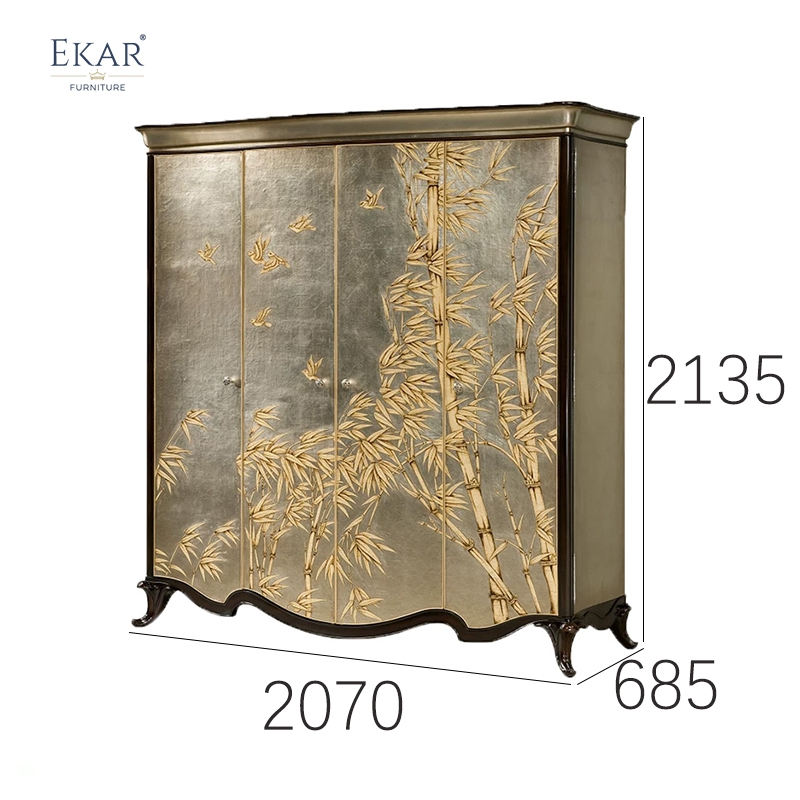 Ultimately, choosing a piece from EKAR FURNITURE is an investment in a global legacy of excellence and structural integrity. As a renowned Foshan customized furniture factory, we understand that every elite home is a reflection of its owner's journey and refined lifestyle. Every component of this wardrobe—from the hand-rubbed protective lacquer over the silver leaf to the reinforced plinth base—is engineered to the highest international standards of durability and aesthetics. This bedroom storage offers more than just utility; it offers a lifestyle of prestige, transforming a daily necessity into a majestic experience. Whether you are furnishing a private estate or a signature guest suite, this masterpiece promises to deliver a visual legacy of elegance and a functional masterpiece that remains a global standard for luxury customized furniture.