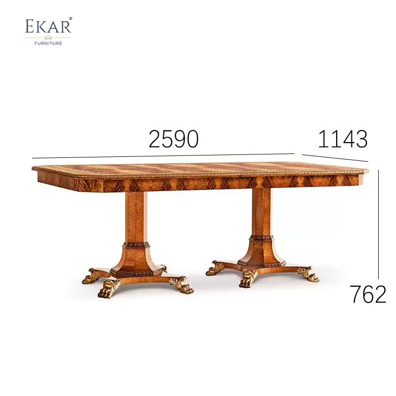 Transform your dining hall with the EKAR St. James Imperial Dining Table. Featuring magnificent burl wood veneers, hand-carved twin pedestals, and gold leaf accents. Expertly crafted by EKAR FURNITURE, a leading Foshan export furniture factory for high-end residential projects and global luxury markets.