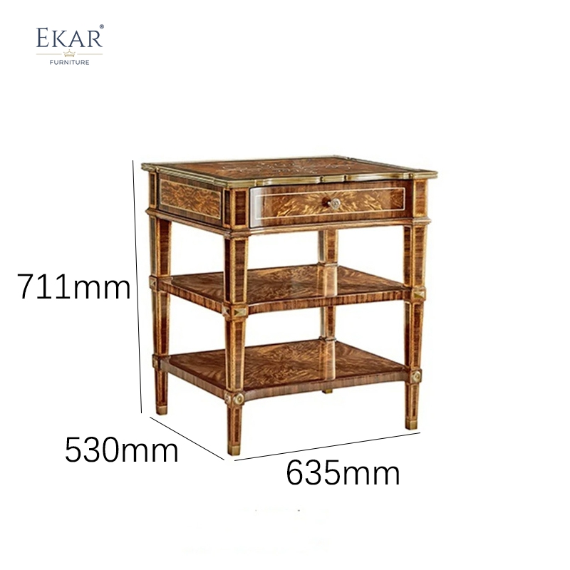 The standout feature of this luxury side table lies in its breathtaking material selection and artisanal surface design, specifically curated for the discerning global eye. The expansive top surface and the two lower tiers are adorned with rare burl wood veneers, showcasing a multi-dimensional grain that radiates a deep, honey-amber warmth. Master artisans at our Foshan customized furniture factory hand-select and book-match every veneer sheet to ensure a visually symmetrical and opulent finish across all levels. The edges are framed with intricate geometric inlays and contrasting timbers, creating a rhythmic visual harmony that catches the light from every angle. This level of material excellence and hand-finished beauty is why our collections are a primary choice for the India imported furniture sector and among prestigious interior designers seeking "one-of-a-kind" quality for their highest-profile residential customized furniture projects.