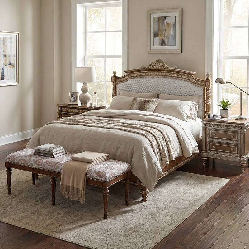 The EKAR Sterling Estate Nightstand reimagines classic American traditional design through a lens of modern glamour. This piece takes the robust architectural forms of historic estate furniture and updates them with a sophisticated metallic silver finish. The result is a bedside companion that feels both timeless and daringly contemporary. It is designed for the homeowner who appreciates the silhouette of the past but desires a touch of sparkle and light in their sanctuary. As a key element of your bedroom furniture, the Sterling Nightstand acts as a jewel box for the room, reflecting ambient light and adding a sense of brightness and airiness. It is the perfect choice for master suites that aim to balance the weight of traditional wood furniture with a fresh, luxurious palette.