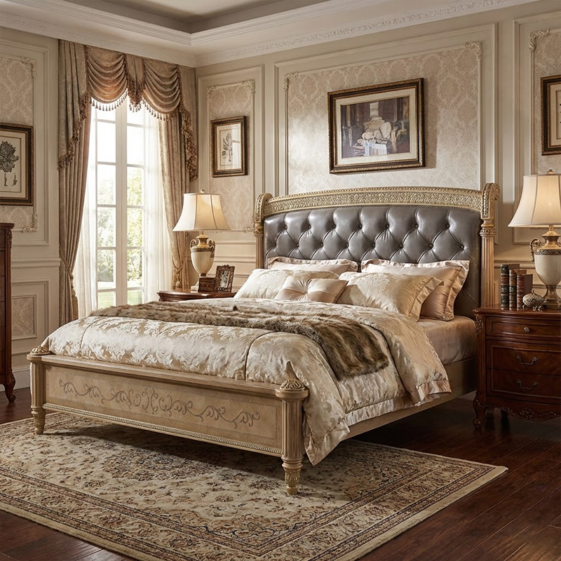The structural beauty of the Sterling Bed lies in its meticulously crafted wood frame. Constructed from premium solid hardwood, the bed features a sophisticated light oak or champagne finish that highlights the natural grain while keeping the room feeling airy and bright. What truly sets this piece apart is the delicate inlay work found on the footboard. Scrolling vine motifs are inlaid into the wood, adding a layer of artistic complexity and visual interest without being overly ornate. The headboard is framed by carved molding and topped with a subtle crest rail, accented with touches of gold or silver leaf that catch the light. The turned legs are fluted and tapered, providing a sturdy foundation while adding a touch of classical elegance. This attention to detailed carpentry showcases the artisanal skill behind every EKAR piece.