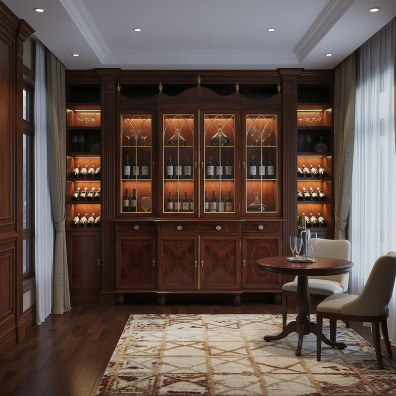 In terms of application, this versatile piece finds its home in the most prestigious interior zones, from grand foyers to master dining halls. In a formal lounge, it acts as a majestic wine library when paired with leather seating and traditional wood-paneled walls. Its unique profile and opulent wood textures make it particularly effective in rooms with high ceilings where its grand proportions can be fully appreciated. Choosing a piece from our Foshan export furniture factory is an investment in a global legacy of success. Choosing EKAR FURNITURE means partnering with a world-class Foshan customized furniture factory to transform a simple wall into a majestic focal point that celebrates the very best in global home decor.