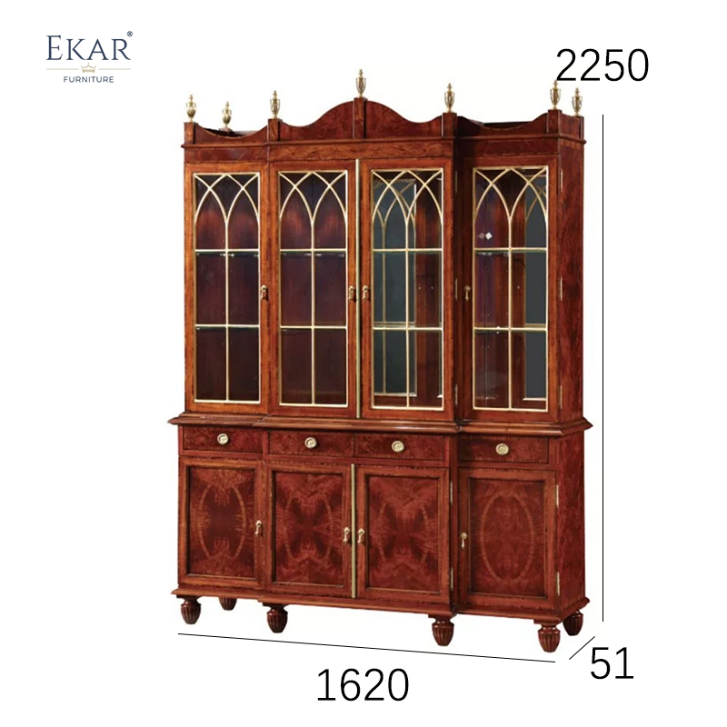 The upper section of the Westminster Heritage is a masterful interplay of display and architectural detail, designed as a showcase for prized stemware, rare vintages, or literary collections. The expansive glass doors are accented with delicate gothic arches and glazing bars, providing a clear view of the interior while protecting contents from dust. The top of the cabinet is crowned with majestic brass-toned finials that add a sense of vertical rhythm and historical power. As a premier mid-to-high-end furniture customization factory, we ensure that even the internal glass shelves are of the highest clarity and strength, supported by reinforced frames that meet global safety and luxury standards for high-performance customized furniture.